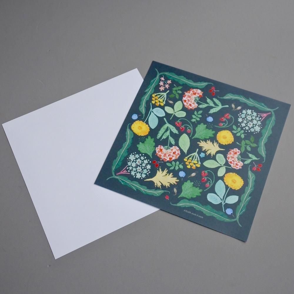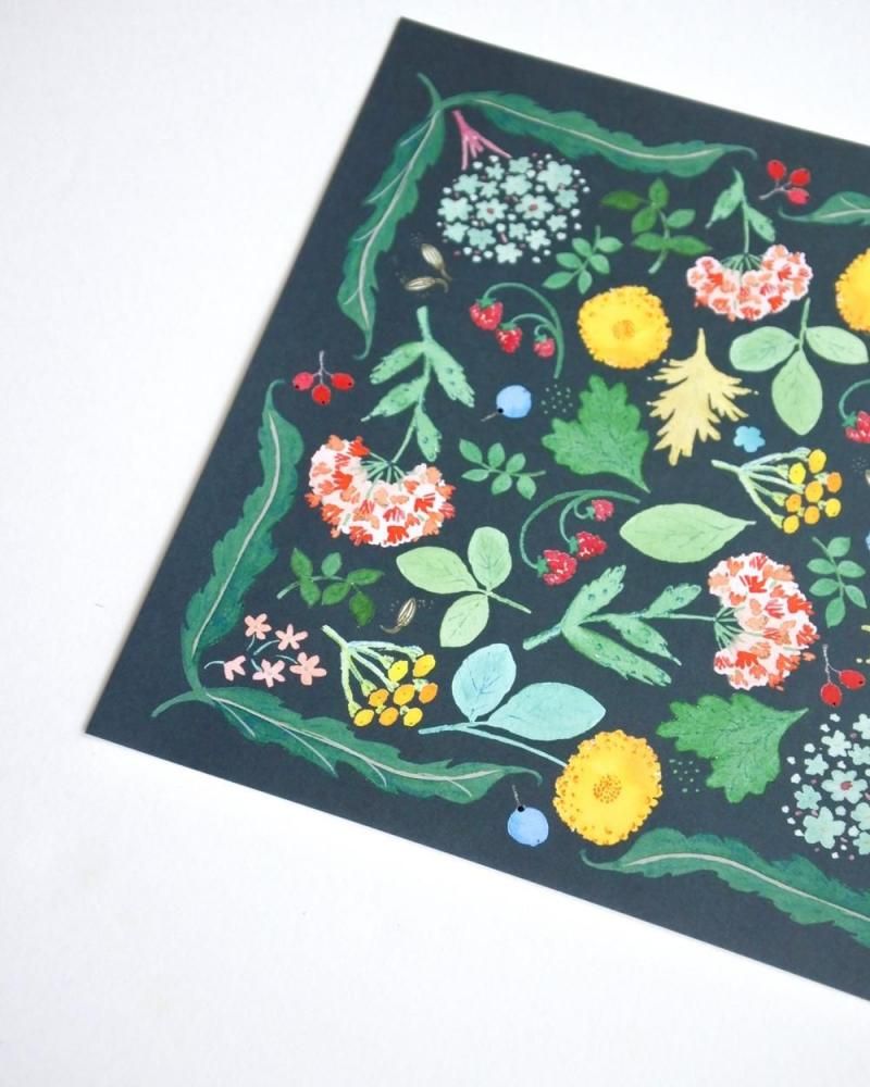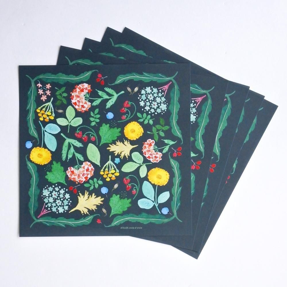 ブルーメンとはドイツ語で花や花びらのこと。深い森のような、または夜空のような、シックなベースカラーに沢山の野花を散りばめました。