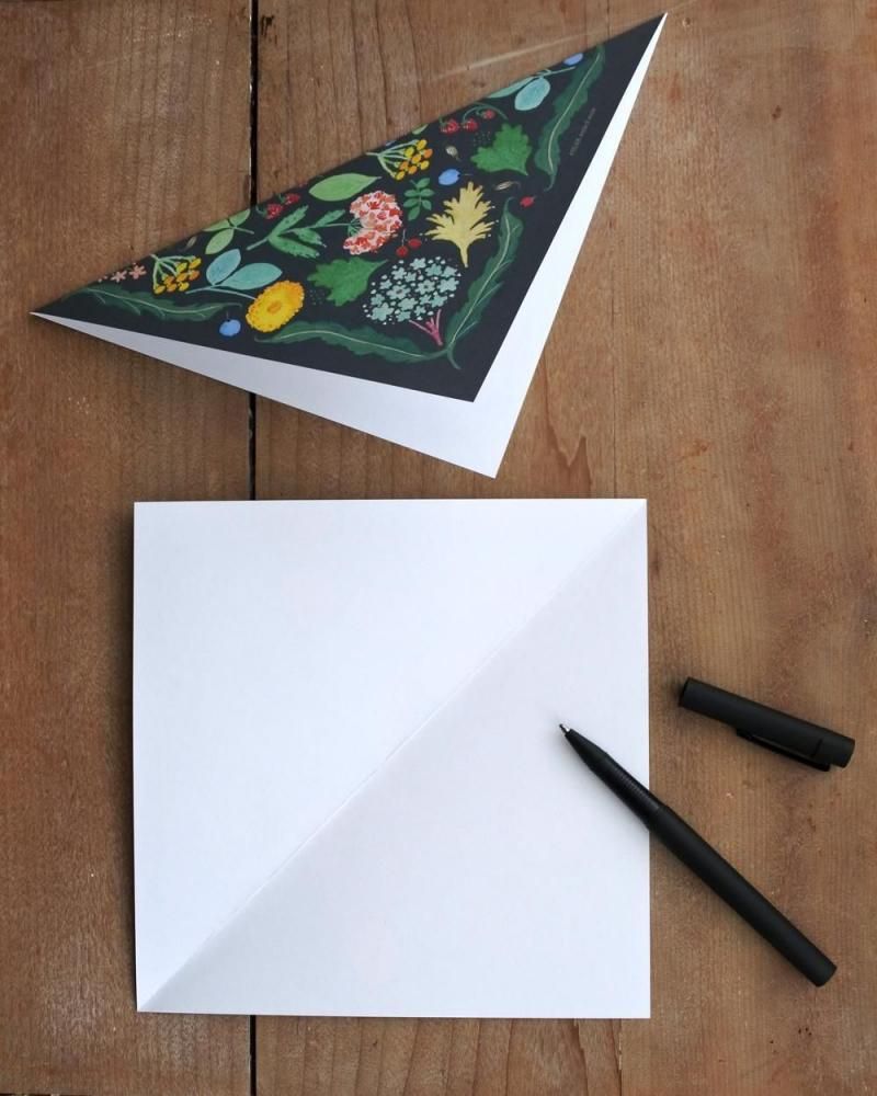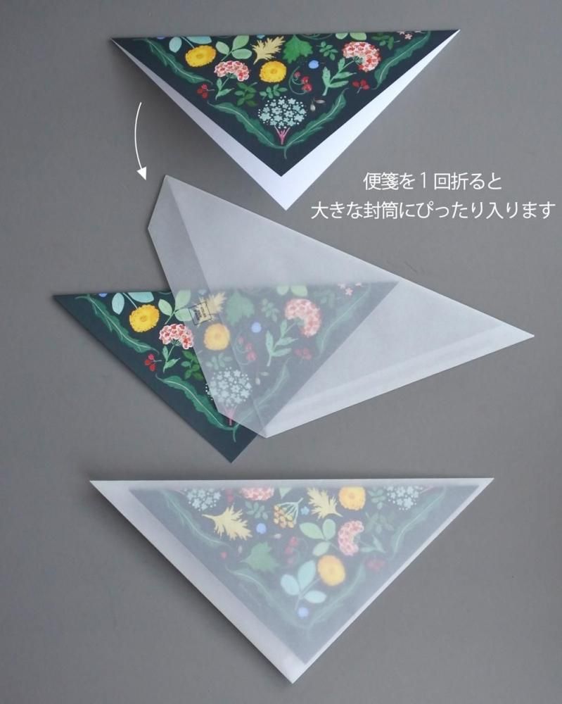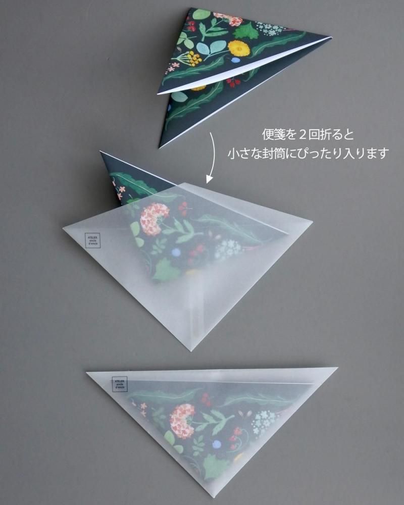 正方形の便箋(裏面は白)に文を綴り、半分に折ると大きな三角封筒にぴったり入ります。四つ折りすると小さな三角封筒にぴったり入ります。